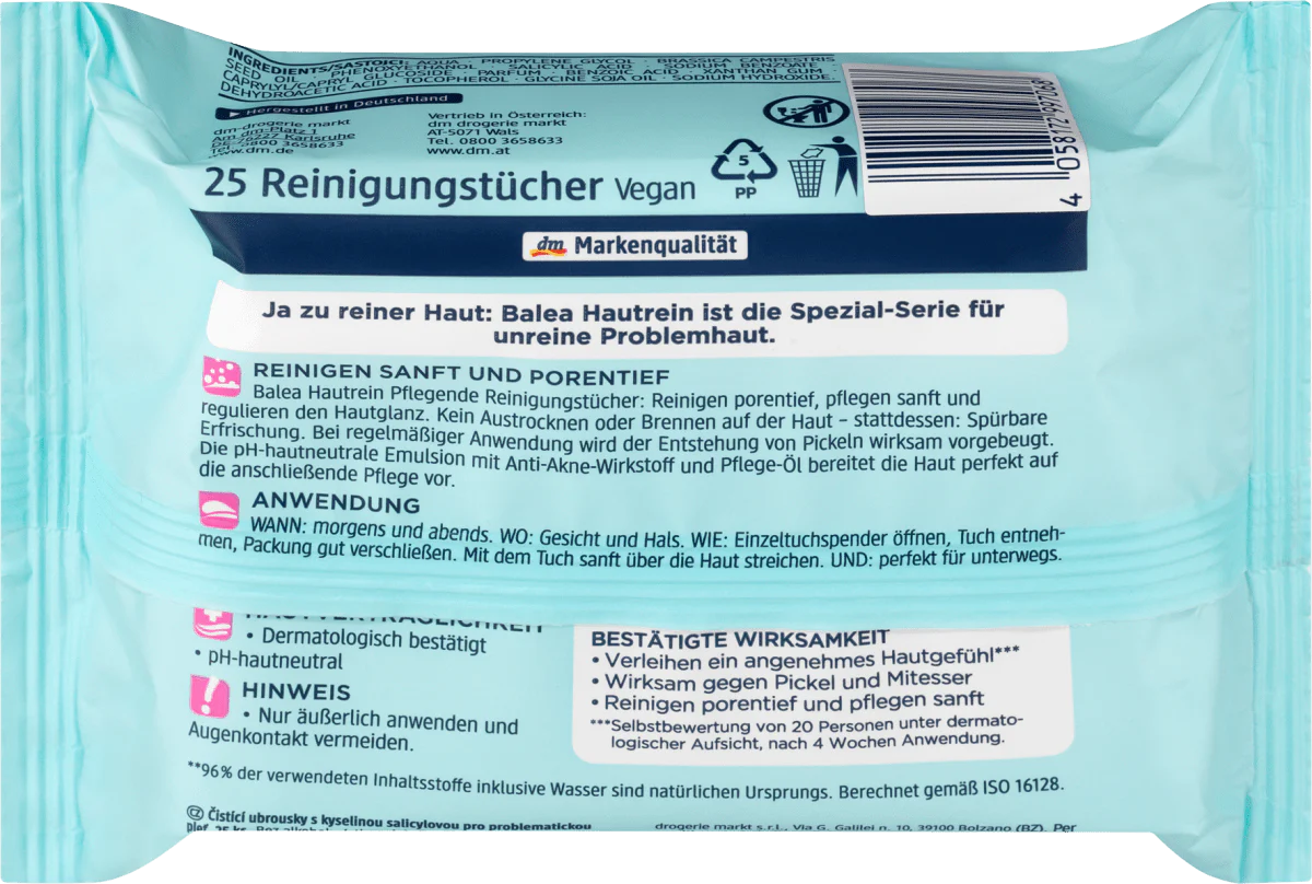 Les lingettes nettoyantes nourrissantes pour la peau de Balea nettoient en douceur et en profondeur dans les pores. Lorsqu’il est utilisé régulièrement, la formation de boutons est efficacement évitée. L’émulsion au pH neutre pour la peau, composée d’actifs anti-acnéiques et d’huile de soin, prépare parfaitement la peau aux soins ultérieurs.