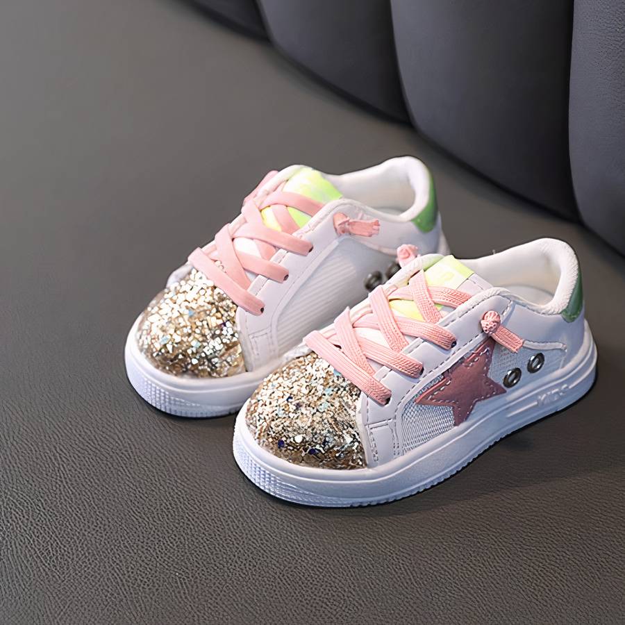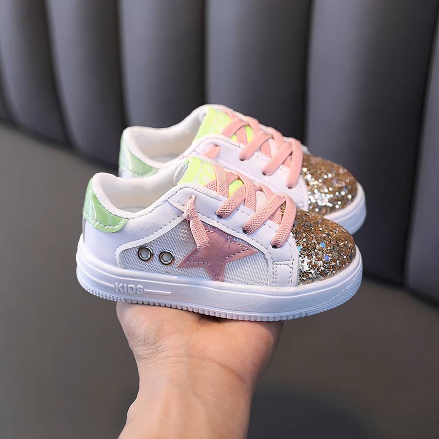 Vous cherchez une basket douce et pailletée pour votre bébé ? Ne cherchez pas plus loin que notre basket souple à paillettes pour bébés ! Fabriquée avec des matériaux supérieurs en maille et en PU, cette chaussure est parfaite pour le printemps et l’automne. La basket est disponible en deux couleurs disponibles.