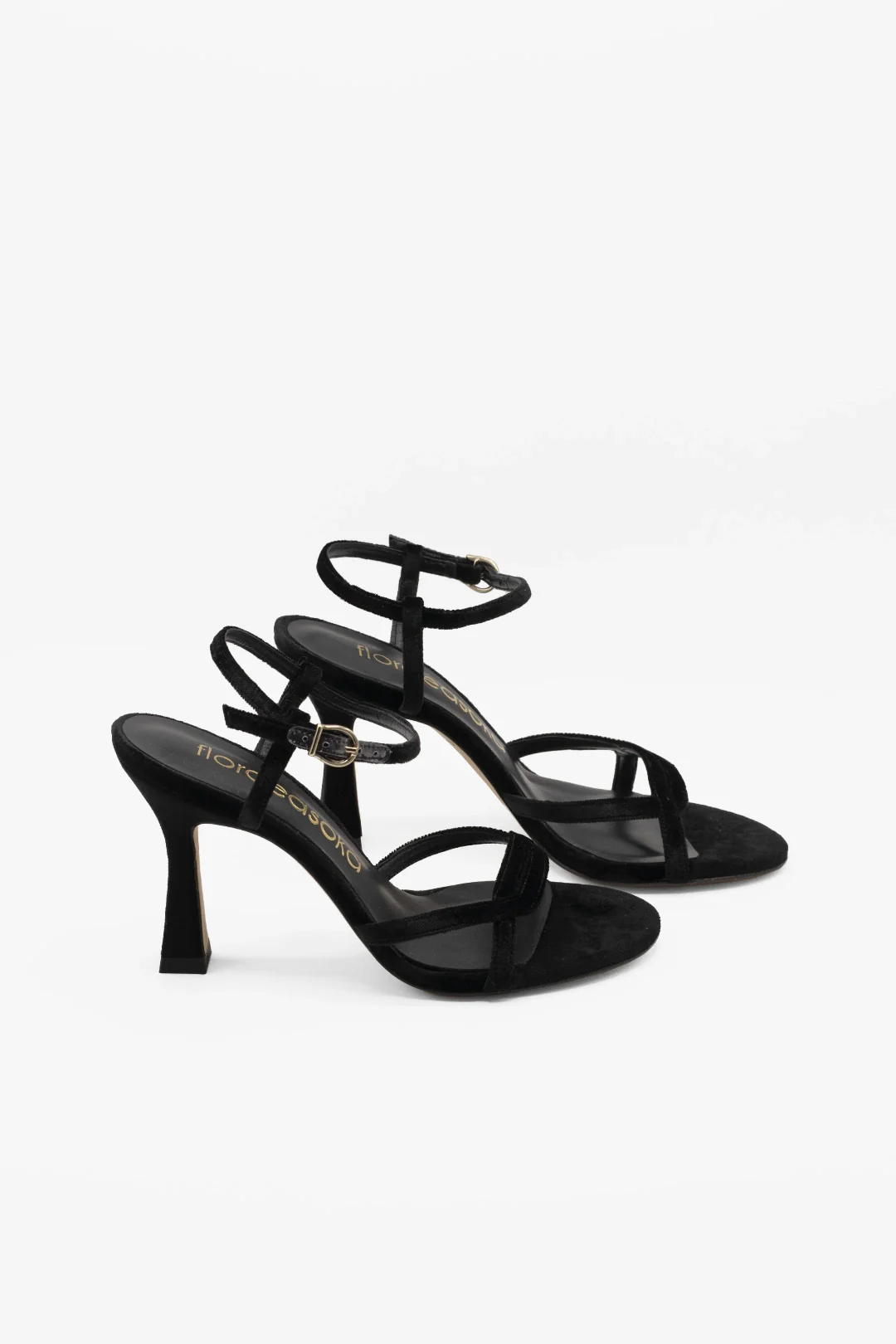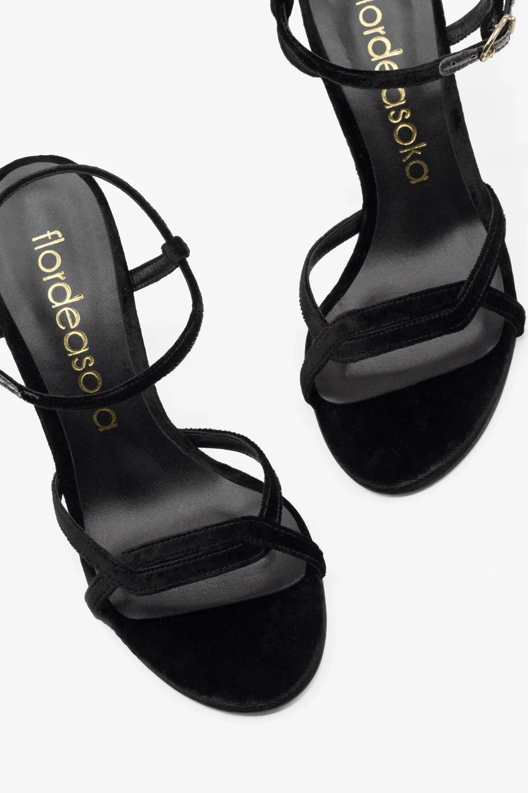 Sandalias con dos tiras cruzadas en terciopelo de seda color negro. Es una aliada infalible ya que combina con absolutamente todo y transforma cualquier conjunto en algo elegante y seguro.