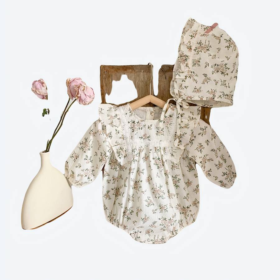 Ensemble barboteuse à manches longues et chapeau fleuri pour bébé