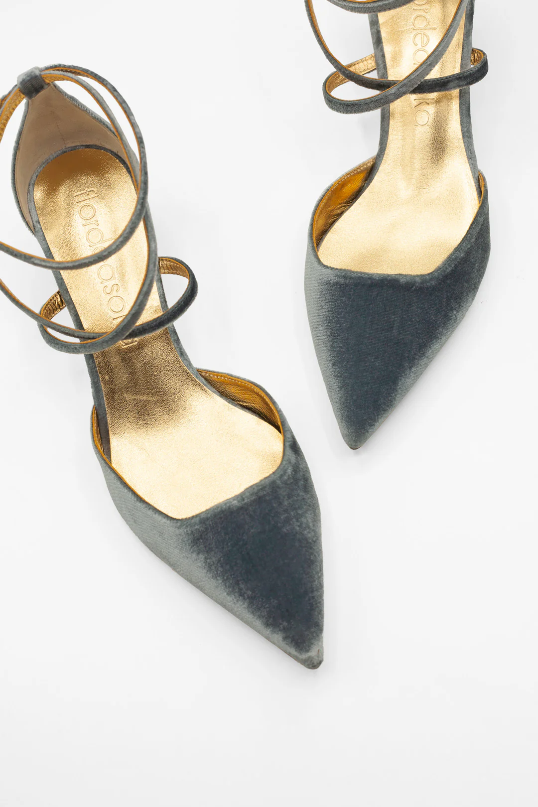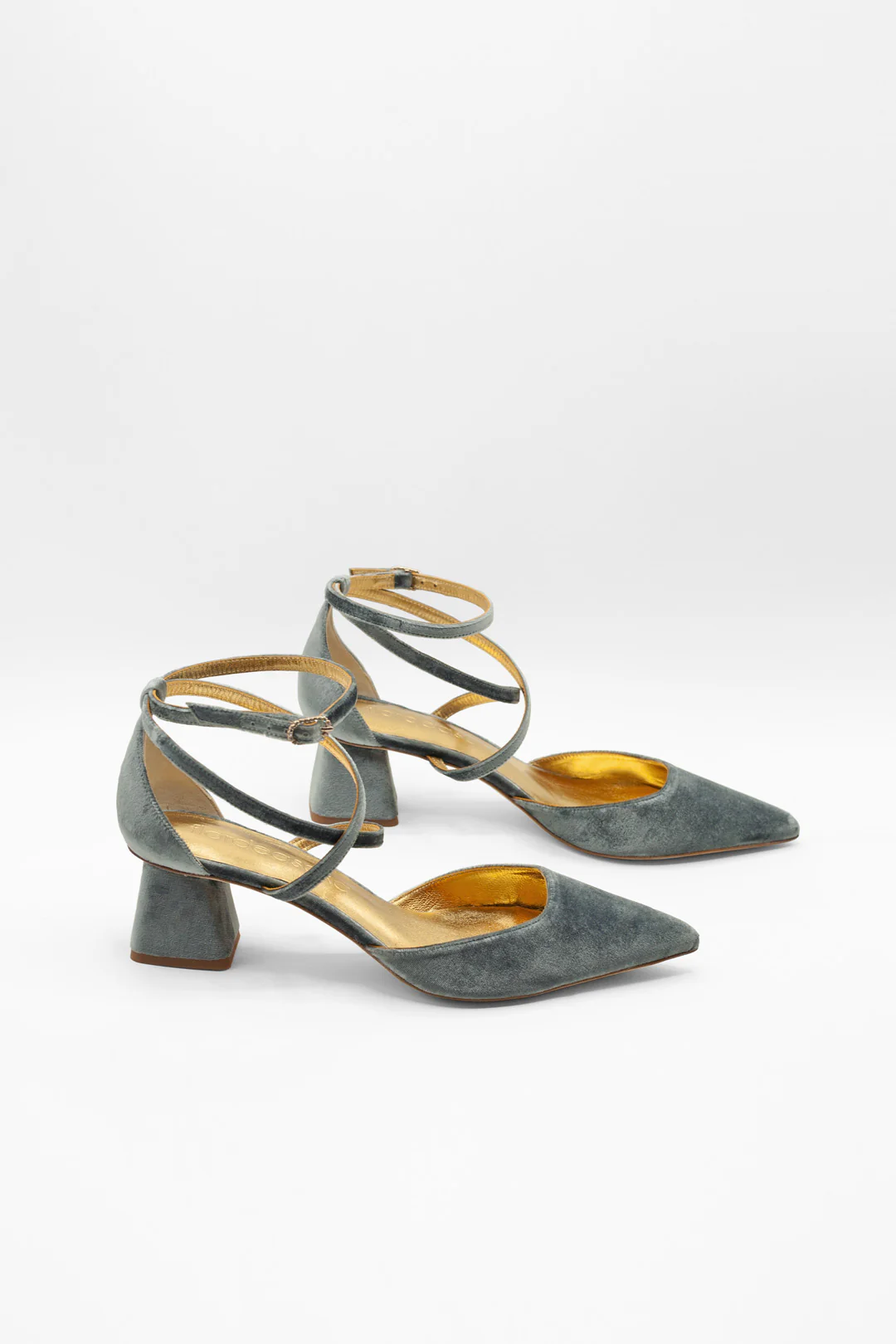 Zapatos de tacón bajo cerrados en punta de terciopelo color topaz, un azul vibrante con matices joya que ilumina cualquier look.