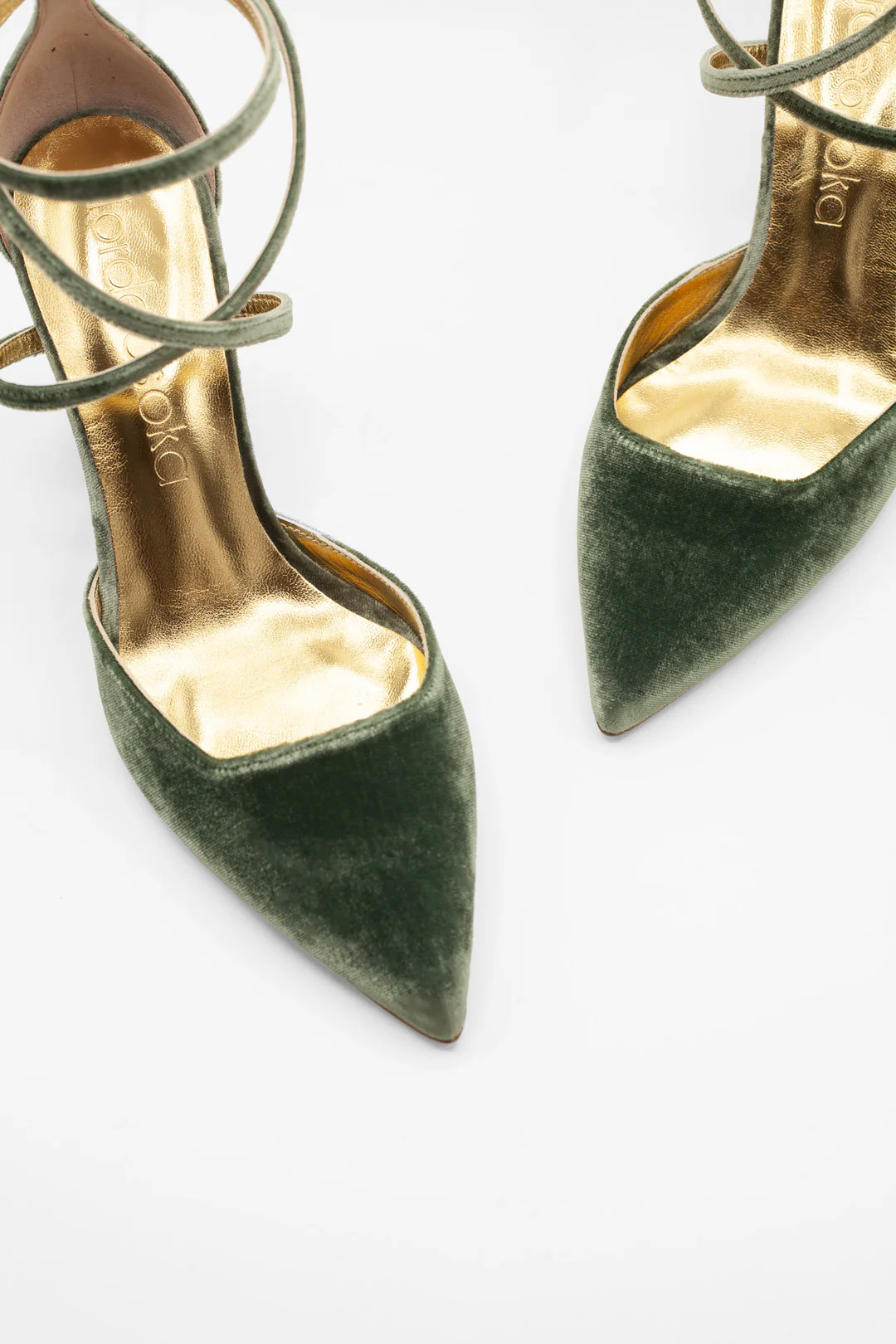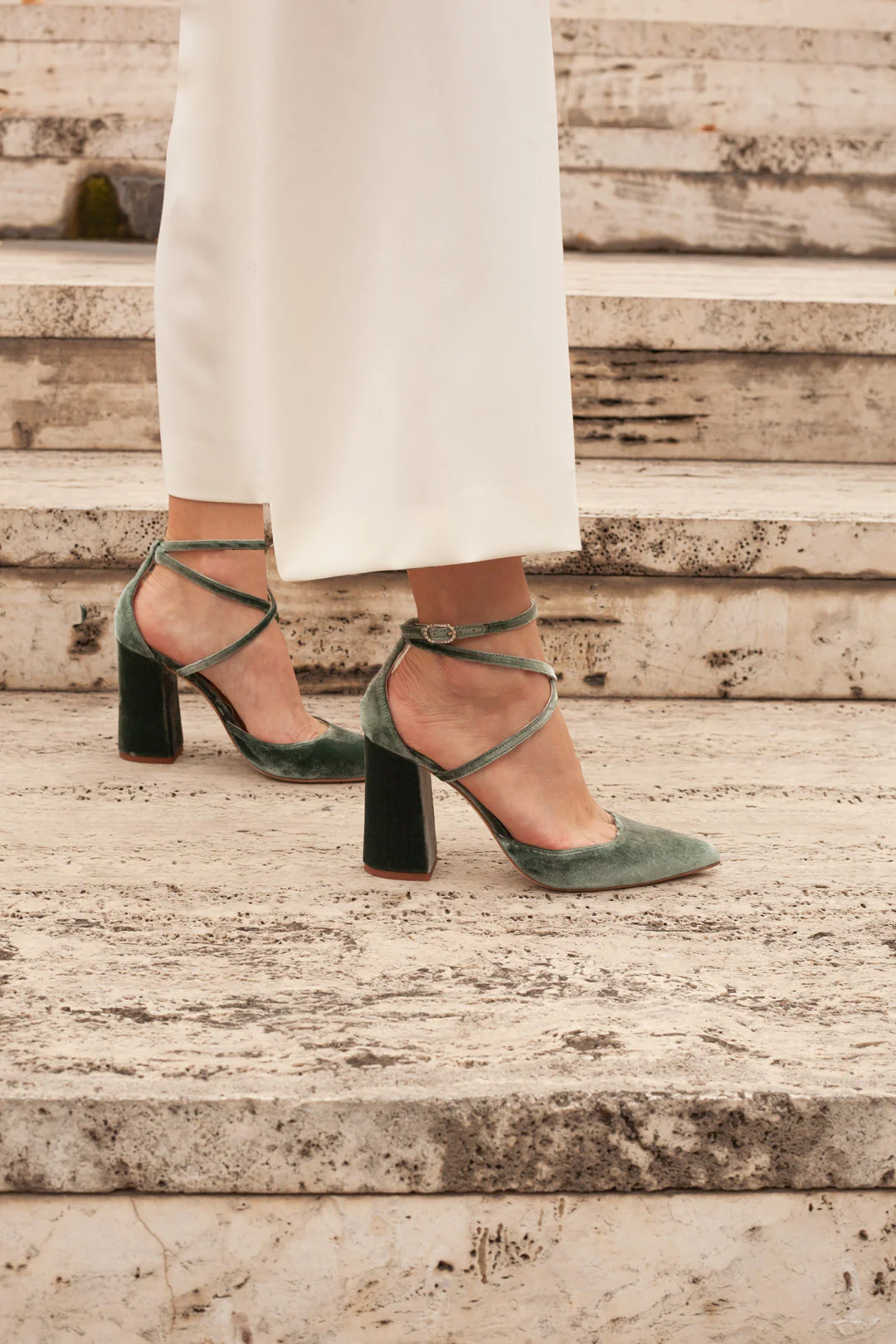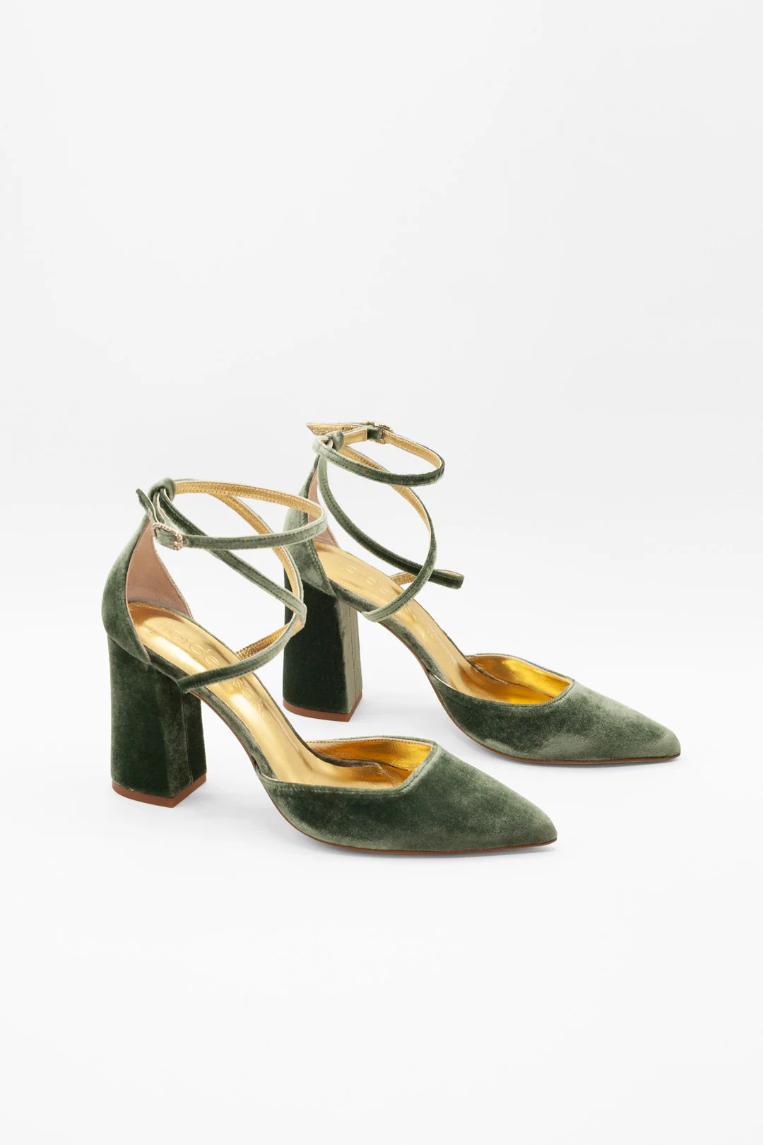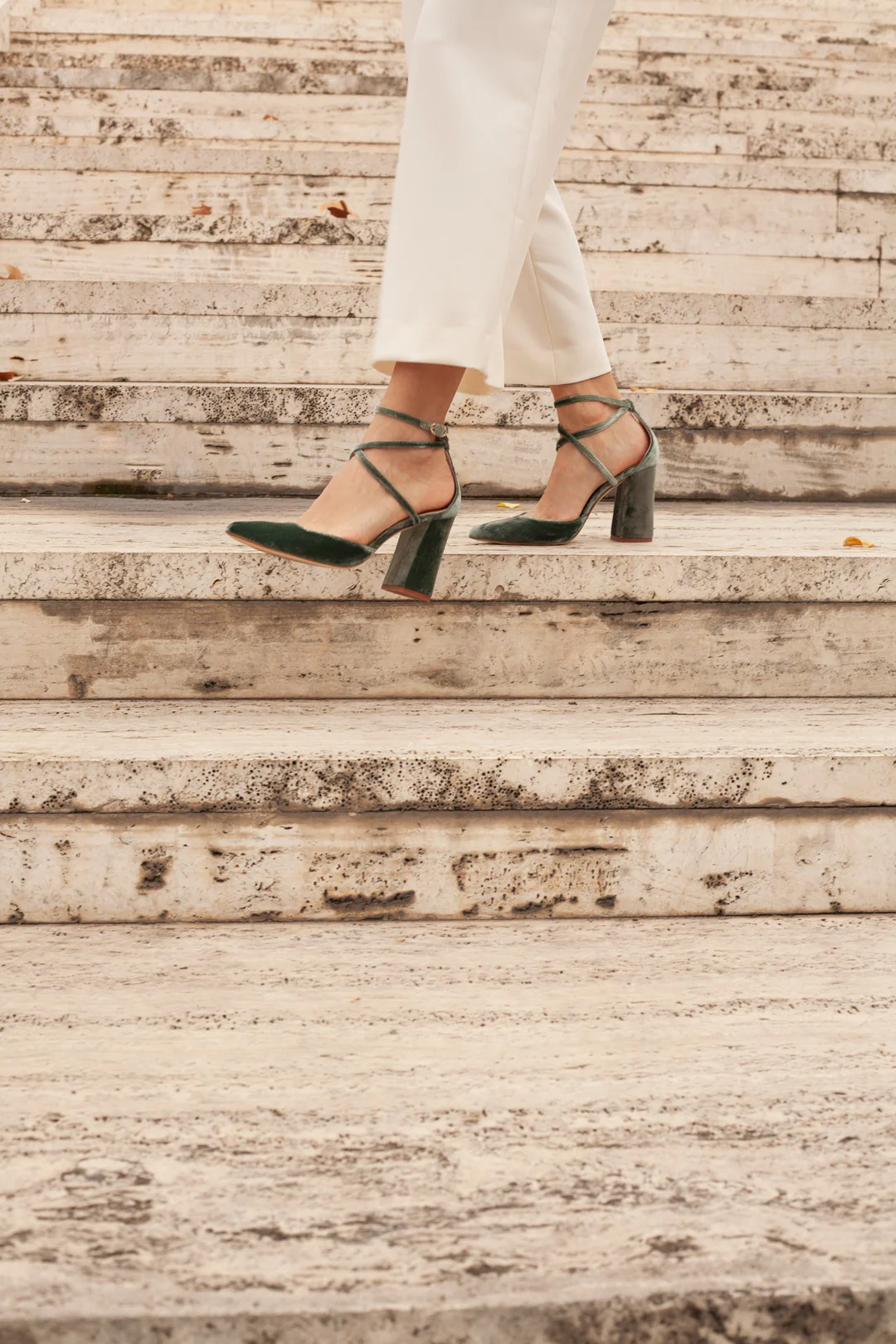 Zapatos de tacón en terciopelo color egeo, un azul profundo y elegante que aporta fuerza y serenidad. Su tacón en bloque de 9 cm, estiliza la figura sin renunciar a la comodidad.