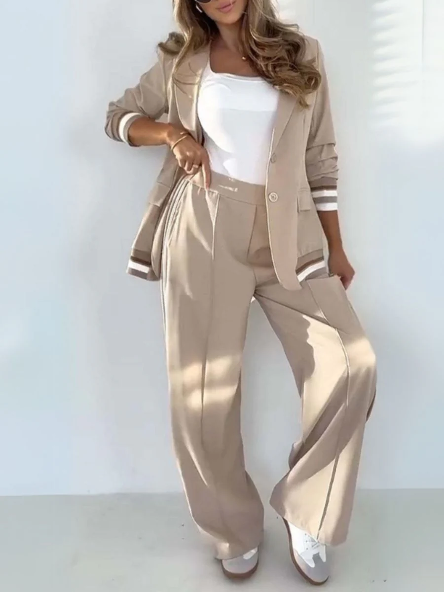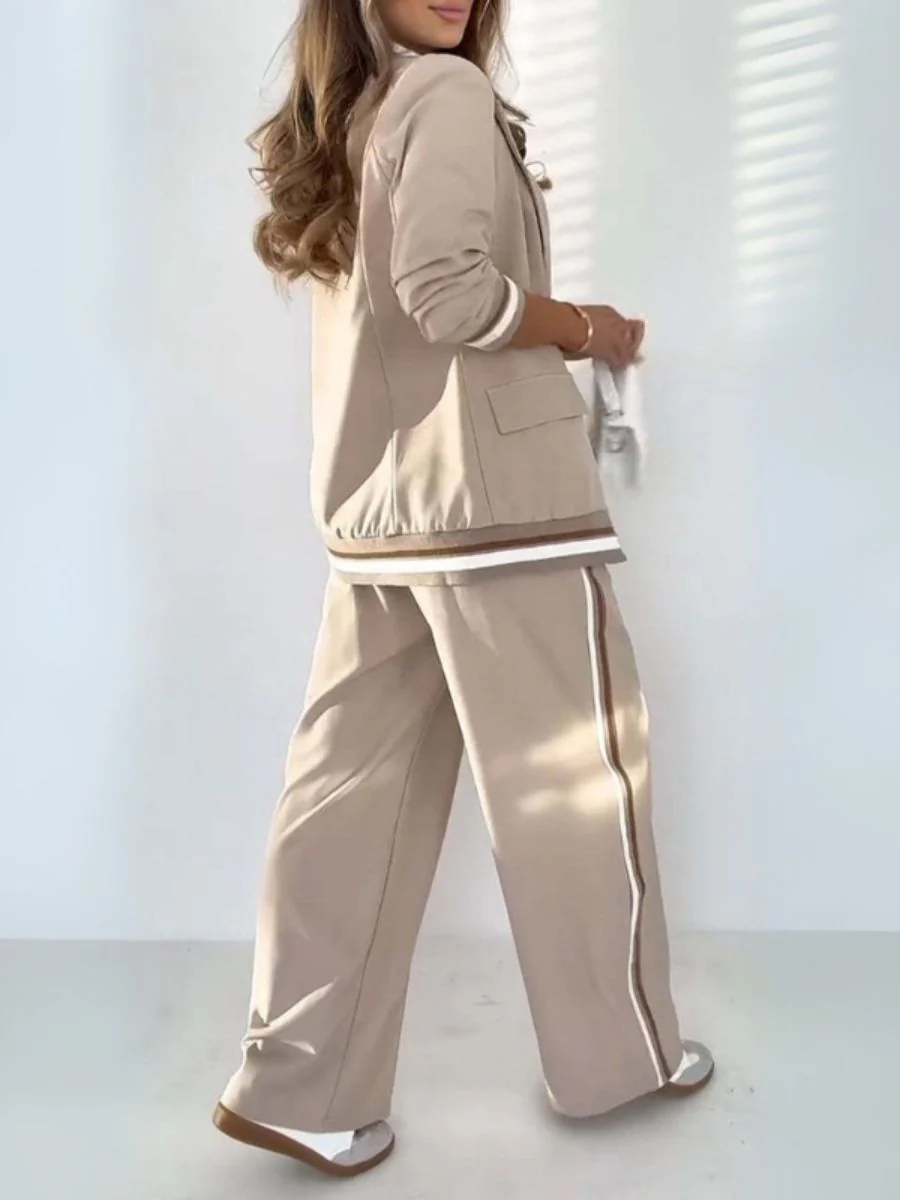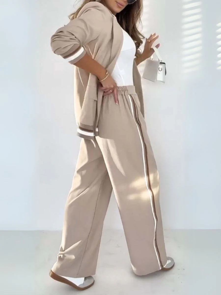 ✅ Design Tendance : Une couleur beige moderne, agrémentée de bandes sportives sur les côtés du pantalon et de la veste pour un look chic et dynamique.