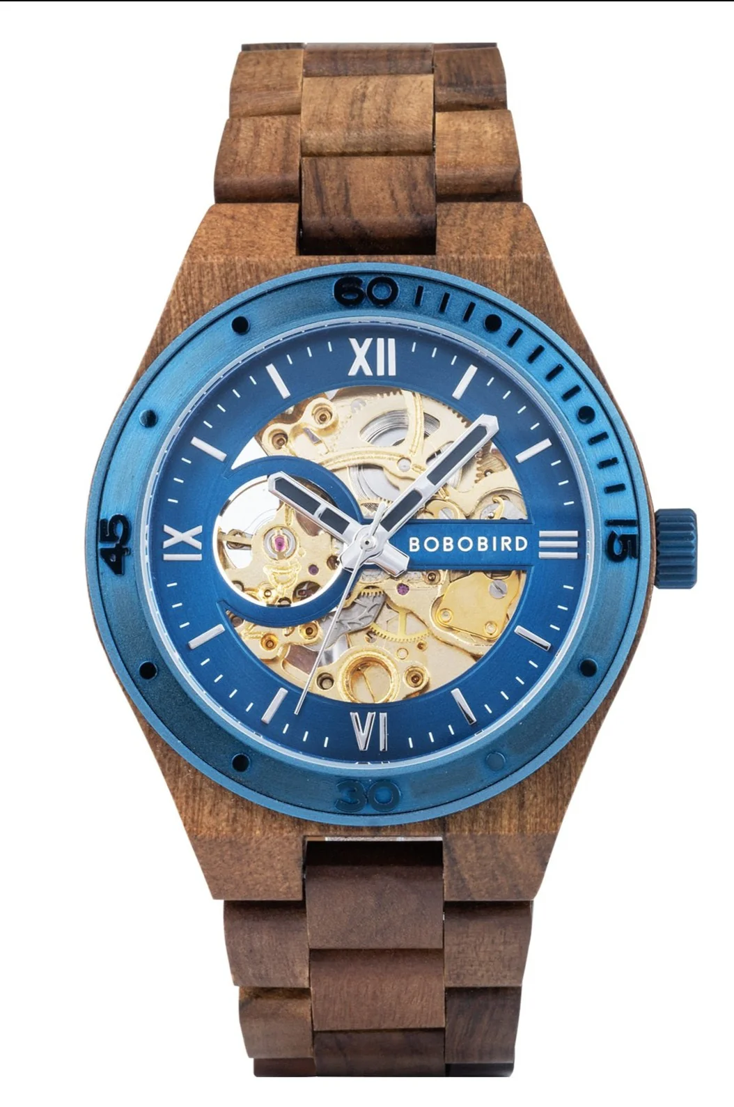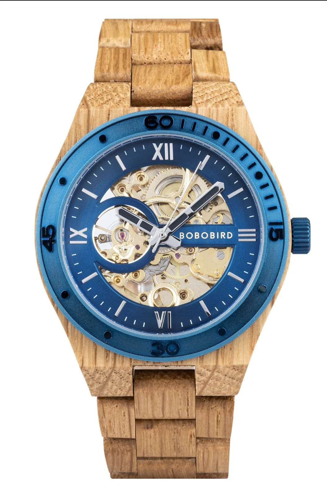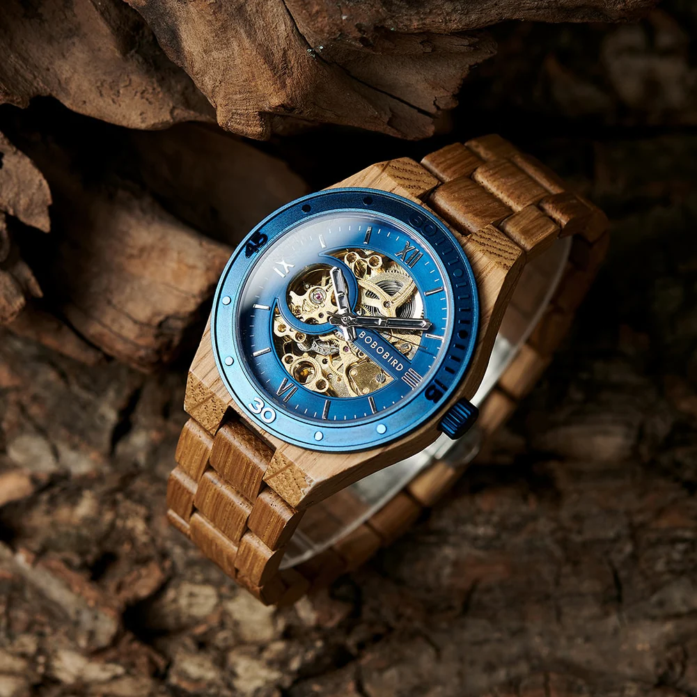 Cette montre apporte son originalité avec sa teinte de bois et son bleu royal, c’est une pièce unique, magnifiquement conçue pour résister dans le temps.