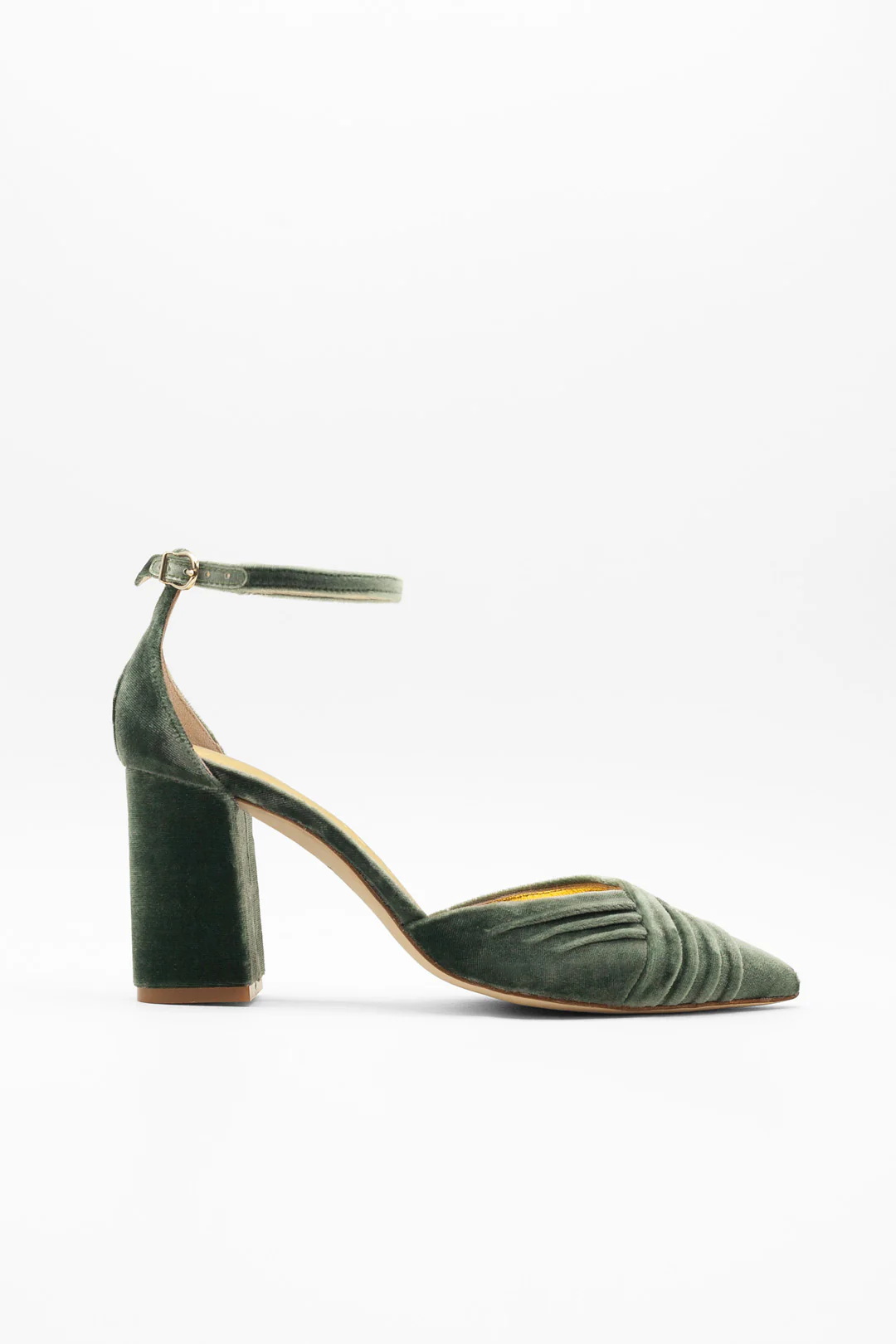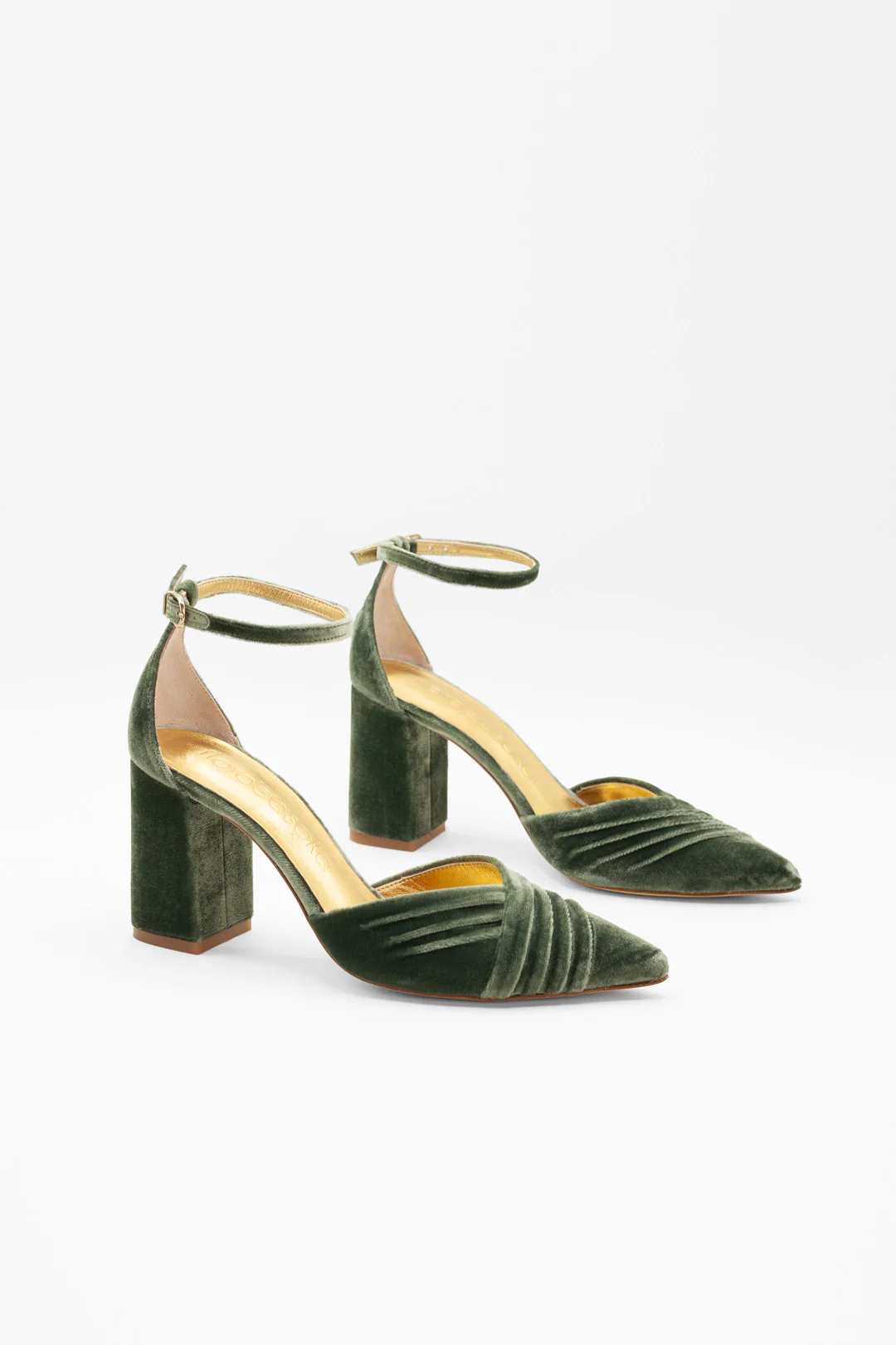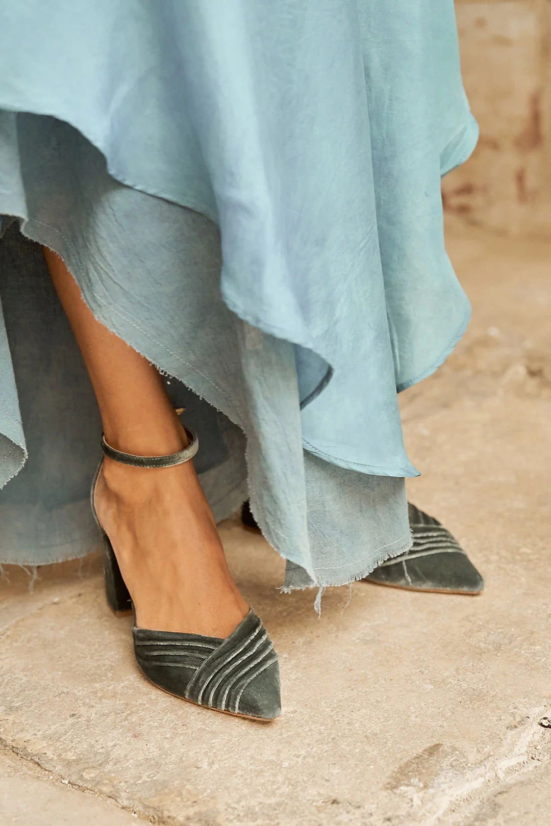 Zapato cerrado en punta en terciopelo color egeo, un azul profundo y elegante que aporta personalidad sin exceso. Con tacón bloque de 8 cm y pulsera al tobillo, ofrece una máxima sujeción y comodidad.