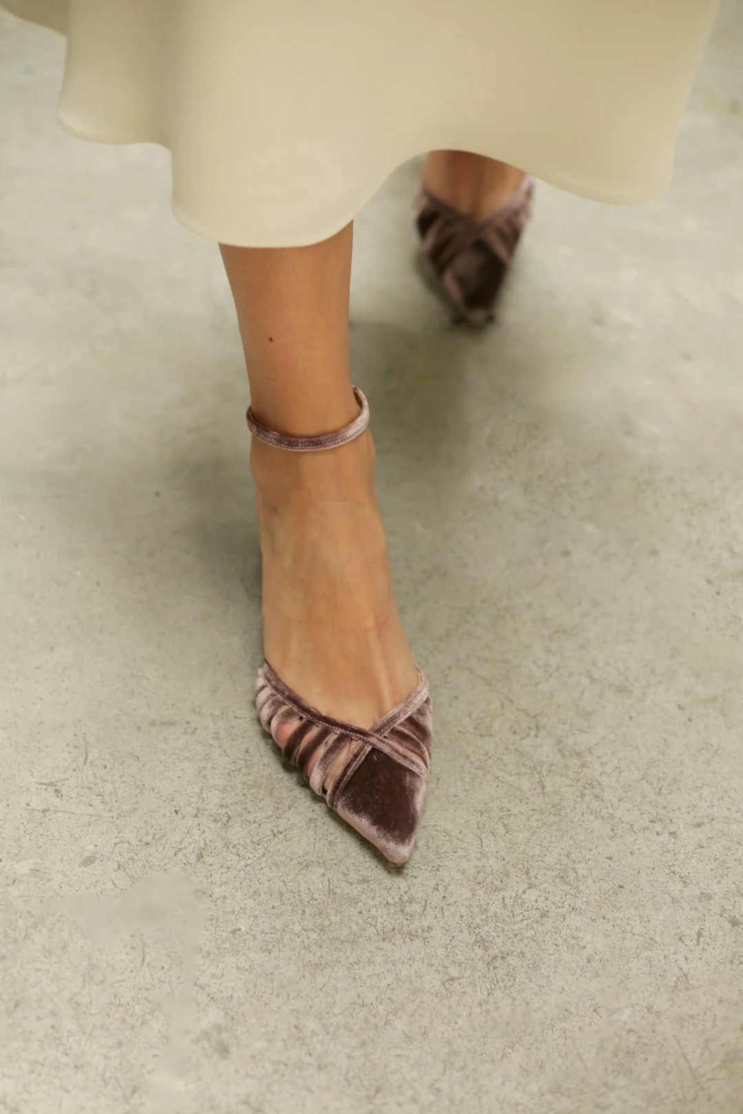 Zapato cerrado en terciopelo de seda en tono morado. Su diseño de tiras cruzadas sujeta el pie de forma segura, mientras que el terciopelo color morado aporta un toque sofisticado y original a cualquier look de novia o invitada.